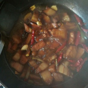 锅中放比炒菜多点油4成热放两勺糖,熬成黄色放入焯好的肉翻炒至焦黄色