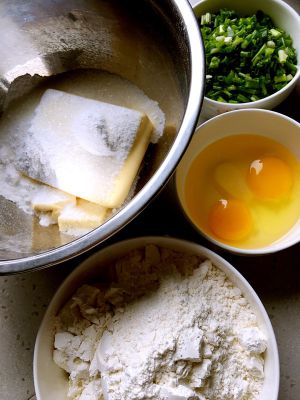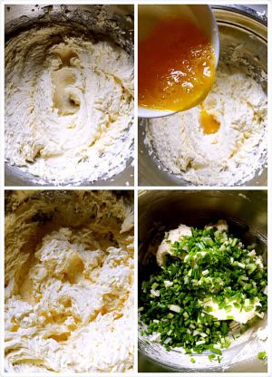 软化的黄油加糖和糖粉打发至色浅轻盈状态;鸡蛋液分三次加入打发的黄油中打至完全融合;再加香葱搅打均匀。