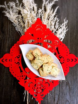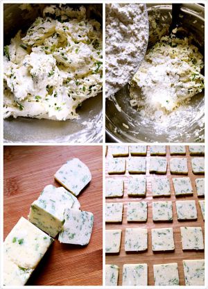 香葱搅匀后,面粉分三次拌匀;用饼干模整形成长条状,冷冻2h后切片,厚度40mm;放入预热好的烤箱中层,165°C20min。(具体时间温度根据自家烤箱而定)
