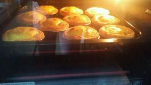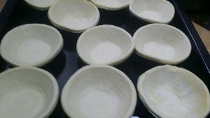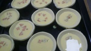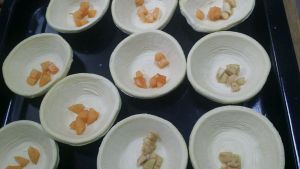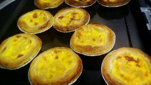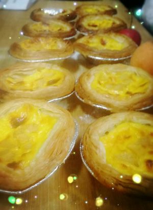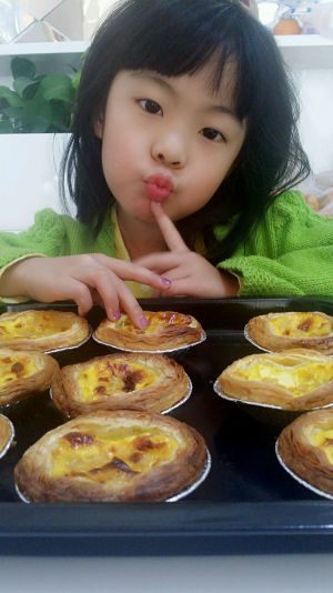 将蛋汁倒入蛋挞皮中,放入烤箱
