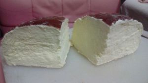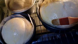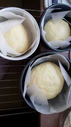把110g牛奶,一个鸡蛋(留5g全蛋液刷面包表面),250g面,40g糖,2g盐,4g酵母,依次放到面包机里,连续用发面团档揉3次基本就能揉出能拉出薄膜的状态,揉到第二次的时候加入30g黄油。发酵好后,揉成稍微扁的圆形,放到6寸或者8寸的蛋糕模具中。(这些材料6寸的能做两个,8寸能做一个,我用两倍材料做了一个8寸,和两个6寸)