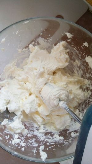 烤面包的时候,制作奶酪馅,将125g奶油奶酪,15g牛奶,15g糖粉,奶粉10g混合,再用电动打蛋器打成顺滑状。