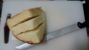 面包烤好了立刻拿出来,晾20分钟左右,在面包温热的时候,一切4份,再在中间切两刀,如图。