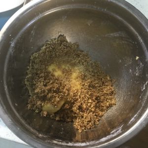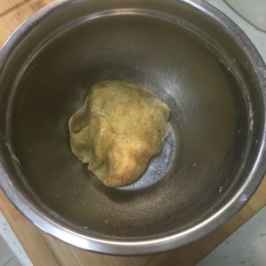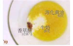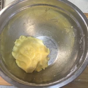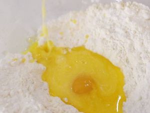 将蛋黄,混合好的黄油倒入面粉,拌匀
