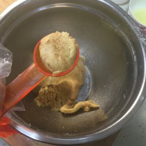 用15ml的小勺一个个挖出面团,以求分量均衡