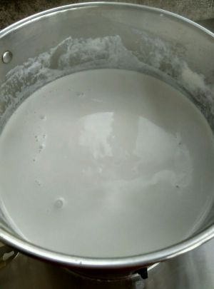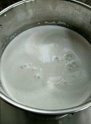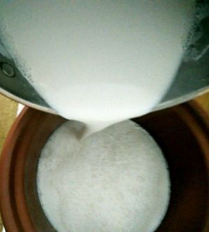 內脂水先倒进锅里,接着从30.40厘米的高度冲入熬好的花生豆浆