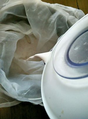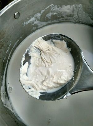 盖好锅盖放置20分钟,表面上有一层清水用勺子撇出来底下就是花生豆腐脑