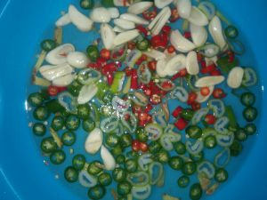 大蒜切片,辣椒、大葱切圈,生姜切粗短丝
