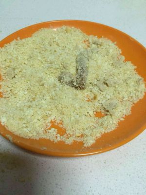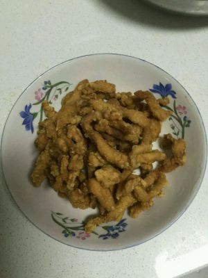 腌肉期间把馍片放保鲜袋用擀面杖或碗压成碎沫备用。热锅凉油,待油温达到七成热时把鸡肉条放馍片渣里滚一下然后下锅炸至金黄出锅