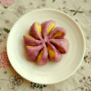还可以用紫薯面皮包南瓜面团,做出来的菊花馒头就是这个样子。