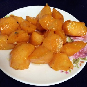 地瓜滚刀切块,放入油中炸,炸至外焦里嫩。注意,油温度不要太高。