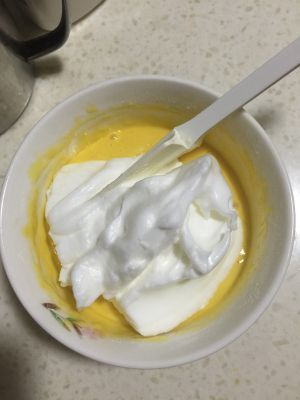 蛋黄糊倒入余下的蛋白霜中,翻拌均匀。