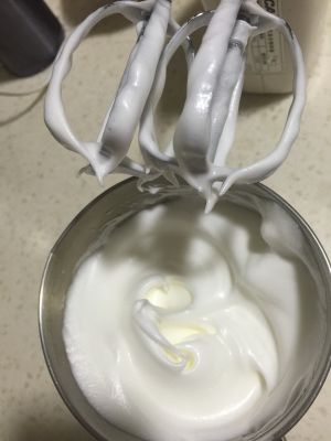 蛋清中挤几滴柠檬汁,分三次加入糖粉,用电动打蛋器高速打发,到搅拌器提起有小尖角,蛋白霜纹路不消失,蛋白就打发好了。