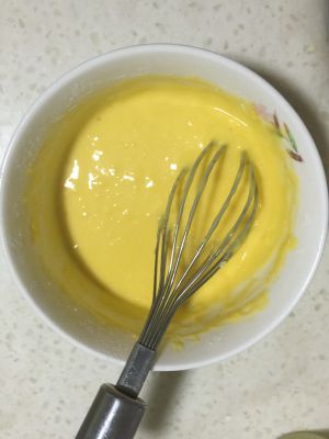 加入一个蛋黄,搅匀后再加下一个,直至四个蛋黄全部加完。