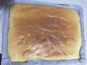 蛋糕糊倒入铺了油纸的烤盘,轻轻抹平,震出气泡。