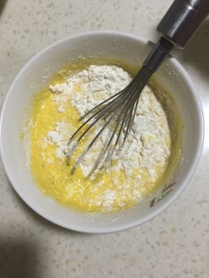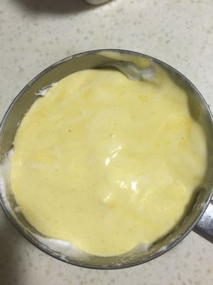 取三分之一蛋白霜加到蛋黄糊里,翻拌均匀,不可画圈搅拌。