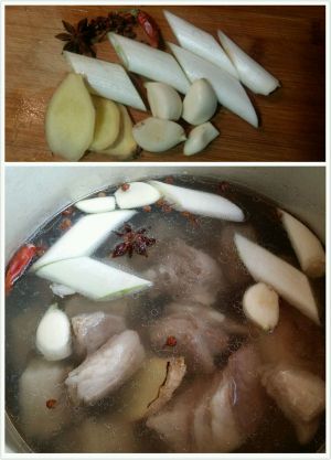 倒入开水,放入葱姜蒜,花椒,大料,料酒,辣椒
