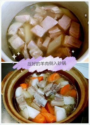 把羊肉汤和肉倒入砂锅,放适量的盐,大火烧开后,中火炖10分钟左右,直至萝卜软烂就可以出锅了。(我这个砂锅用了一半的羊肉,剩下的半锅我们涮锅用了,就像吃涮羊肉一下,涮些菜什么的,一锅两吃哟!)