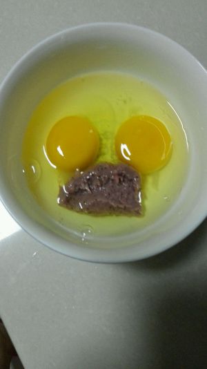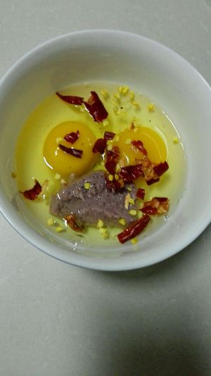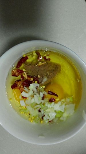 碗里打入两个鸡蛋,倒入两大勺咸虾酱。