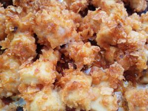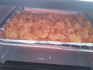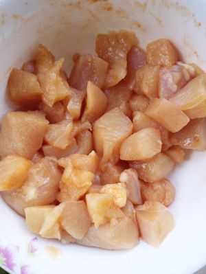 把鸡丁放入碎薯片中摇晃 使劲摇晃 让鸡丁身上沾满薯片 放入烤箱 200度15分钟