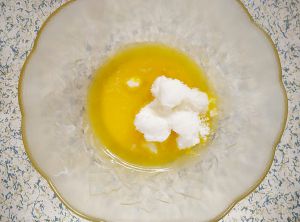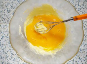 黄油融化成液体后,加入细砂糖搅打均匀。