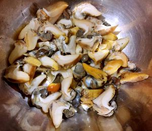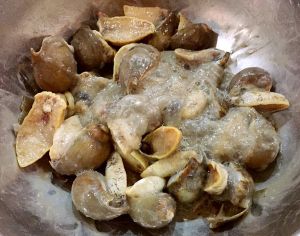 清水洗了7、8遍才洗干净,洗净的假鲍鱼沥干水份备用