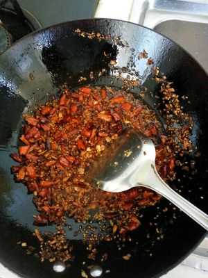 锅内倒油烧热,倒入辣椒,调至小火慢慢炸,过程中要慢慢搅动,以免糊锅。大概十分钟左右倒入葱花等调料,加入适量的盐,开中火再继续搅动(中途觉得油少,可以适量添加)
