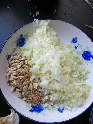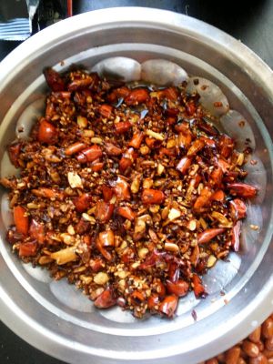 把干辣椒剪成小段,用开水烫,最后头天晚上烫,水凉后把水倒出,辣椒沥干,转天中午再进行炸,花生米,芝麻,我这次又加了瓜子仁。