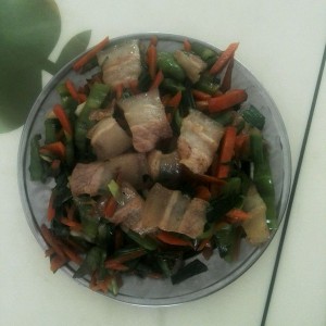 将准备好的五花肉切小块放锅里用水煮大约10分钟,取出后切片
