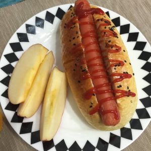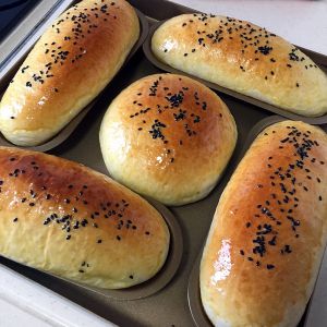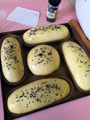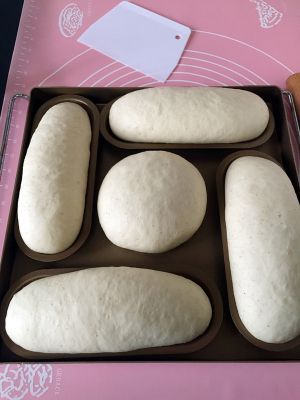 发好的面团排气,整形好放入热狗模具里进行二发!(二发放进烤箱里放一杯热水发酵40分钟左右)