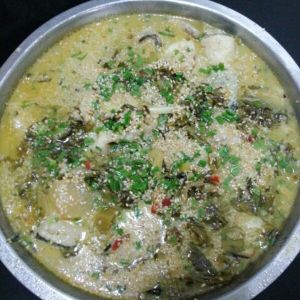 一个小时后,开火葱姜蒜爆香酸菜包,炒熟后加热水,水开后先下鱼头鱼骨,煮熟后下鱼片,变色熟了即可盛出来,撒上香葱,炒熟的白芝麻,再另起一锅烧热油,淋在鱼身上即可(爱吃辣的可以最后油炸花椒,辣椒浇在鱼上)