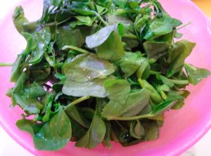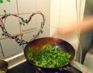 开火,油烧到七成的时候,放入蒜爆香,然后倒入豌豆尖。