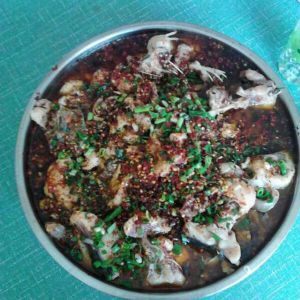 调料包里的干辣椒均匀撒在鱼上,烧油淋浇辣椒上,最后把葱花撒上就完成了