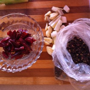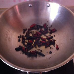 锅中放油,加入花椒粒和干辣椒段,小火炸香。