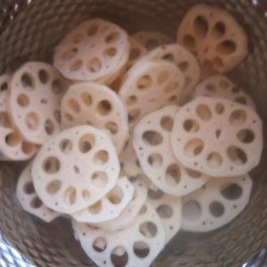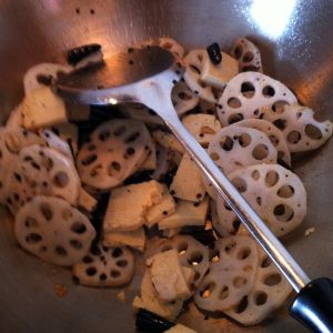 加入藕片翻炒,放葱花和蒜片,翻匀,倒入冻豆腐继续翻炒。