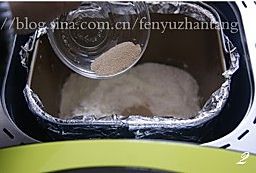 将称量好的水和鸡蛋液倒入面包桶,然后倒入砂糖、盐(砂糖和食盐可充分接触液体便于溶解),接下来是倒入高筋面粉、奶粉,最后倒入酵母(酵母要最后放入,不要接母触到盐,盐会杀死酵母)。顺序是液体—糖和盐—粉类—酵母。