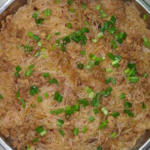 热油锅倒入肉末爆炒片刻,然后加入粉丝和所有调味料翻炒3分钟起锅装盘,撒上葱花大功告成