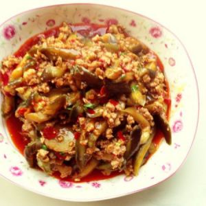锅中再加少许油、煸炒肉馅、待肉馅变色、加入葱姜蒜爆香、再加入郫县豆瓣酱、最后加入煸好得茄子、加少许盐(一点点)、继续翻炒、出锅前加入香菜和蒜末、大功告成