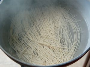 锅中水烧开,入面条煮开至面条断生。(不同的面条时间不同,用筷子夹断看一下断面有无白芯)