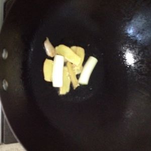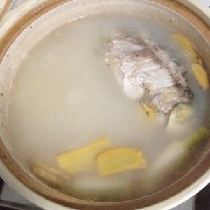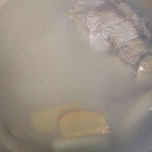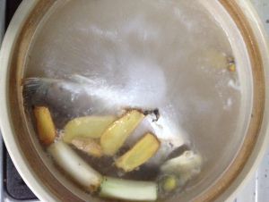 在沸腾的水中加入煸煎过的'热乎的鲫鱼和姜片葱段'