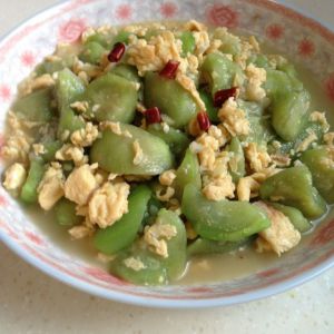 丝瓜变软后,加入盐、鸡蛋翻炒,差不多再加点味精!