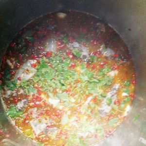 炒锅放一勺油烧热放置一会撒入干辣椒末(我省去了花椒喝汤时候不用麻烦挑出来)浇入鱼汤中撒入香菜末开吃