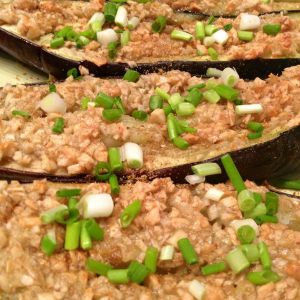 将蒜油均匀的抹在茄子上。200度25分钟。(因烤箱功率不一样,时间会有所误差)