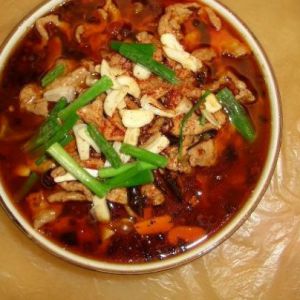 倒入铺有青菜的碗中,然后洒上适量的花椒、红辣椒面、葱和蒜;