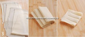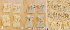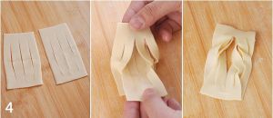 压好的5档厚度面皮,切成长约12cm,宽约5-6cm的面片。取两片,对折,如图切三刀。
