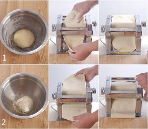咸面团(主料)揉好。压面机压好面皮,1档-3档-5档的顺序。