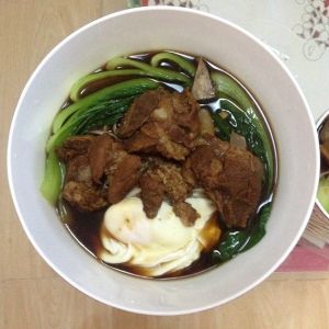 将面放入碗中,加入菜,几煮好的排骨,如果喜欢吃荷包蛋,可以顺便煮一个,加入做好的排骨,排骨汤。汤会咸一些,可以加少量水调和,这样汤也可以喝啦。