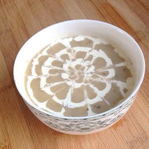 可把剩余奶油挤在蘑菇汤表面,用牙签划成花样~