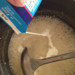 再加入20克面粉小火做成黄油炒面,注意不要炒糊了。加入两碗左右清水,小火慢慢煮开