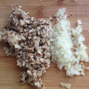 将香菇和洋葱切成碎末,越碎越好。有料理机的话加些奶油打成糊也成~